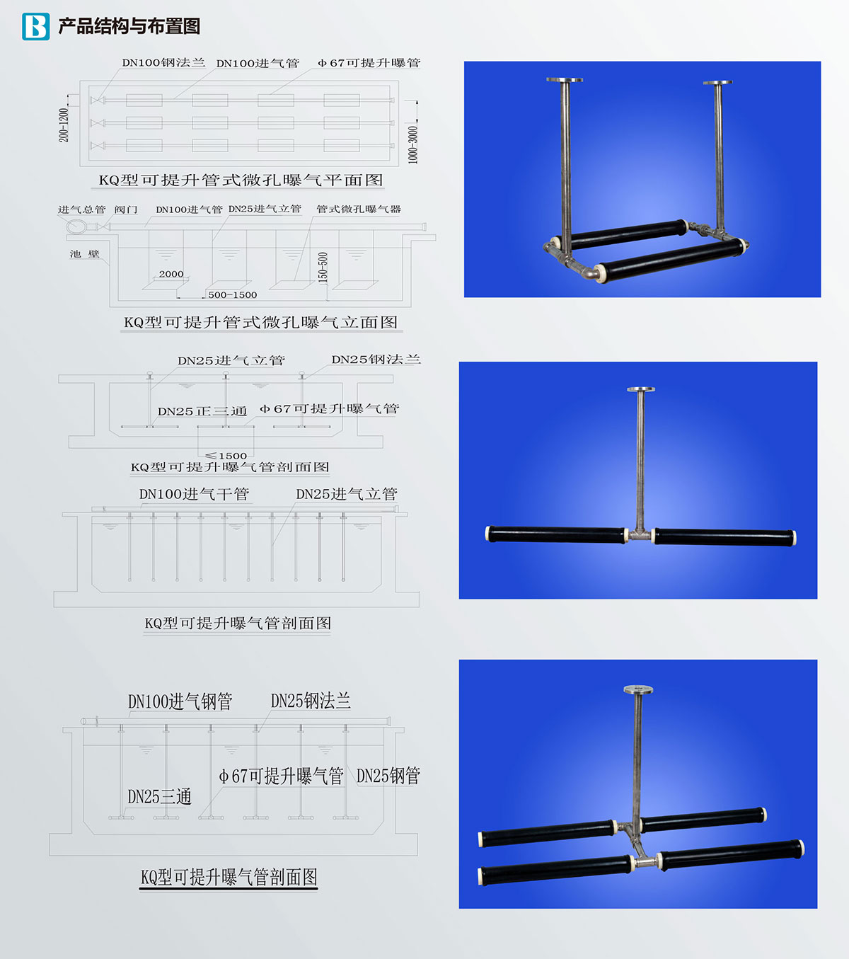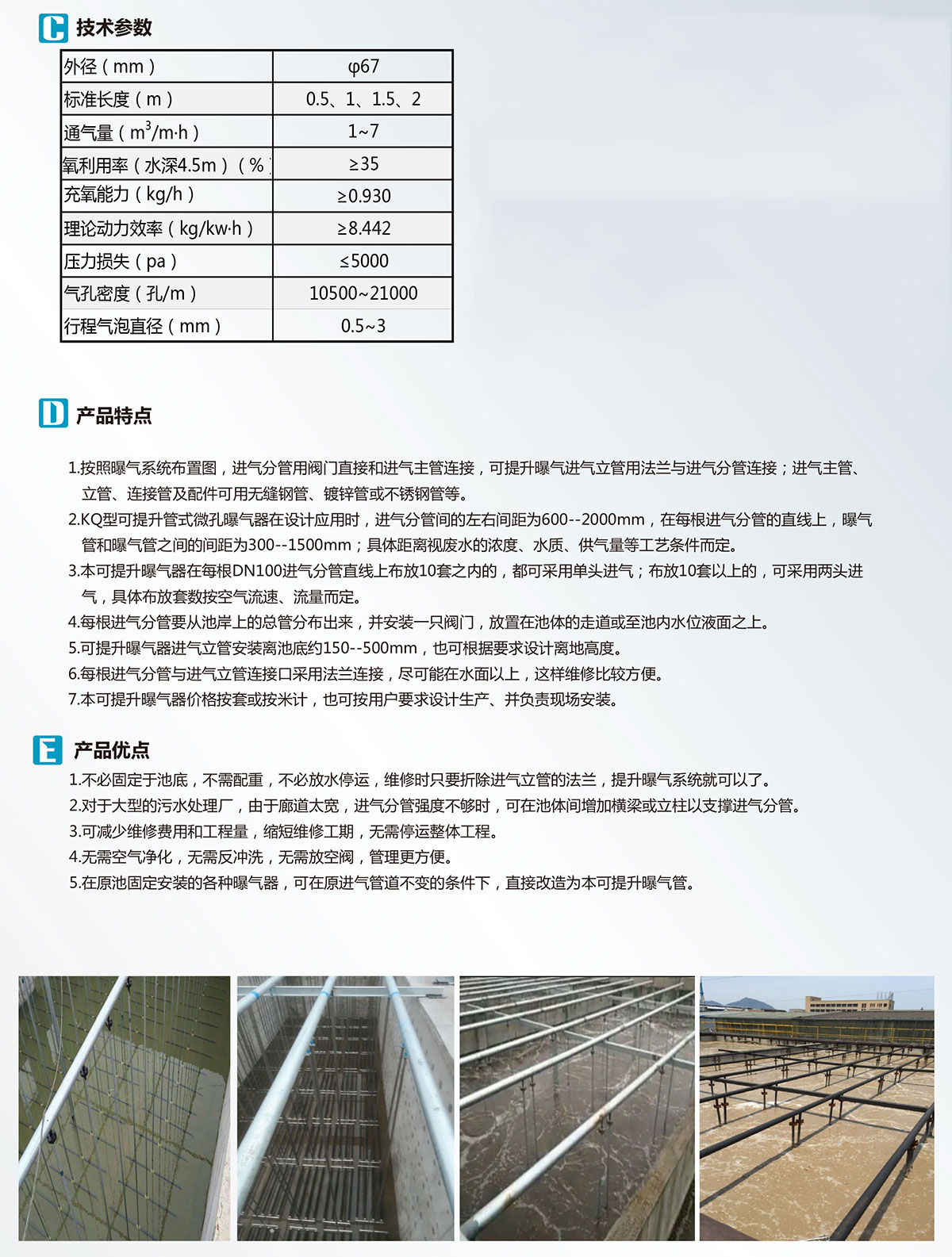 KQ型可提升管式微孔曝氣器操作簡單,維護便捷。保養和維修過程中無需中斷系統運行,兼容性設計,因此該裝置適應性強,適合于新建污水處理廠和現有污水廠的改造,是一種高效率的裝置,每個裝置連接曝氣管的長度最多可達100米。