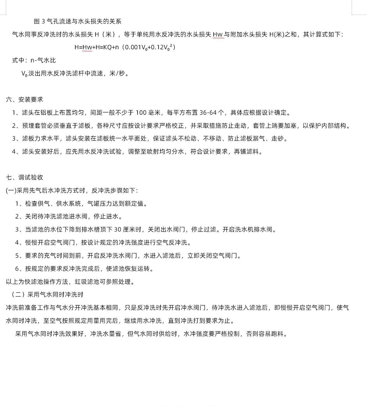 濾頭采用ABS工程塑料制造,由濾帽、濾帽座、濾桿、預埋管套、密封圈等五部分組成,濾頭分為長柄和短柄慮頭兩種、濾板采用鋼筋混凝土或ABS濾板制造為配合應用。